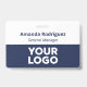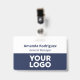 Make your business look professional with custom name badges featuring your company logo, employee name, and job title. Customize it in the sidebar. The staff person's name appears at the top in bold navy blue text with the job title or custom text below it in a navy italic font on a white background. The bottom half of the badge features your logo on a dark blue background. This design works best with white or light colored logos.