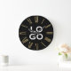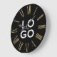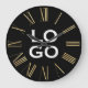 This simple yet sophisticated custom wall clock features a black background with a sample company of business logo placed in the center. You can personalize the clock to add your own company or business logo, or other custom image. The hours are printed in a gold foil design, Roman numeral pattern.