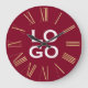 This simple yet sophisticated custom wall clock features a dark red or burgundy colored background with a sample company of business logo placed in the center. You can personalize the clock to add your own company or business logo, or other custom image. The hours are printed in a gold foil design, Roman numeral pattern.