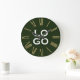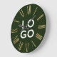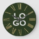 This simple yet sophisticated custom wall clock features a dark forest green colored background with a sample company of business logo placed in the center. You can personalize the clock to add your own company or business logo, or other custom image. The hours are printed in a gold foil design, Roman numeral pattern.