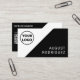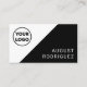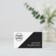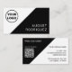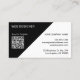 Modern black and white geometric business cards feature your logo on white and your name in white text on black on the front. The back features a customizable QR code, your job title/specialty/company name, and contact information on a reversed black and white color block pattern to the front. Personalize the QR code with your portfolio or website link and add your logo and text in the sidebar. Your logo can be any shape or color.
