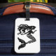 Custom luggage tag shown in black and white with a cute fancy mermaid print and has a business card slot on the other side.