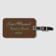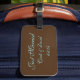 Custom luggage tag is shown in a brown and light blue color with Just Married text.