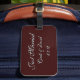Custom luggage tag shown in brown/aqua with Just Married text.