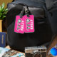 Custom luggage tag with cute volleyball design. Pink or other color. Personalized labels for sport bags and suitcases.