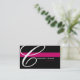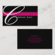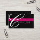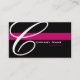 A black background with a dark pink stripe. Replace the large "C" with the first letter of your company's name for a custom look. All of your contact information is on the back of the card. Font and font size and color can be changed.
