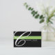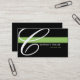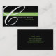 A black background with a green stripe. Replace the large "C" with the first letter of your company's name for a custom look. All of your contact information is on the back of the card. Font and font size and color can be changed.