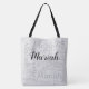 A nice and monogrammed design for a black and gray totebag. A pattern of personalized names of different font styles, with a big initial