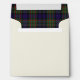 Lovely custom square invitation envelope done in cream, with the colorful purple, green, yellow, black, and red clan MacLellan tartan pattern, on the inside of the envelope. Black script text return address, on the back flap, is ready to personalize. Perfect finishing touch to our MacLellan plaid Holiday invitations.