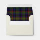 Lovely custom note card envelope done in cream, with the colorful purple, green, yellow, black, and red clan MacLellan tartan pattern, on the inside of the envelope. Black script text return address, on the back flap, is ready to personalize. Perfect finishing touch to our MacLellan plaid Thank You note card.