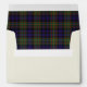 Lovely custom envelope done in cream, with the colorful purple, green, yellow, black, and red clan MacLellan tartan pattern, on the inside of the envelope. Black script text return address, on the back flap, is ready to personalize. Perfect addition to our MacLellan plaid wedding invitation set.