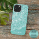 Contemporary white Mandala rosette pattern on a light teal blue green colored background. With room to customize or personalize with a name, monogram initial, or zen word of your choice. Beautiful, modern, and cool cover for the trend-savvy and art-loving hip trendsetter, artsy motif lover who wants to protect their phone from dust and dirt, wear and tear. This design is available in Apple iPhone 6, 7 and 8 Plus, 10 or X, XR, XS, 11, 12, 13 Mini, 14, 15 Plus, and Pro Max cellphone cases. Show off your style, look fashionable trendy, and feel stylish with a unique design on a mobile device accessory of your choice.