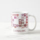 Beautiful contemporary mauve taupe, blush pink, coral red, violet purple and white colored geometric circles and half circles pattern on a white background. With option to customize or personalize with a name, monogram or initials of your choice. Ornate, elegant, stylish and eclectic design for the fancy artistic fashionista, the artsy fashion diva, popular hip trendsetter, vintage retro art style and abstract digital geometric motif lover. Show off your personal style, look fashionable trendy and feel stylish with a unique design on a coffee or tea mug of your choice.