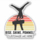 This cool mens gymnastics sticker features a male gymnast in a handstand on a pommel horse in front of a beautiful sunset. The funny quote reads RISE SHINE POMMEL. Customize with a gym or name.