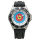 Custom men's watch with archery target bullseye symbol.