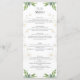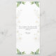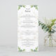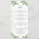 This elegant wedding menu features delicate greenery and white floral accents framing the text. The design is both sophisticated and natural, perfect for a semi-formal celebration. The floral artwork surrounding the menu gives a fresh, organic feel. Fully customizable text allows for clear, tailored information about the dining experience and ingredients. The back provides a heartfelt message of gratitude, leaving space for personal touches or more menu details.