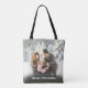 Create a personalized tote bag featuring your favorite photo. This custom tote is perfect for showing off your square shaped photo. There's a spot to add a custom message or name in bold white lettering against a dark olive green overlay. The image and text appear on both sides of the bag.