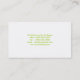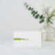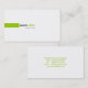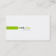 A modern design with a green rectangle centered to the left side on a white background with black text for the first name and matching green for the last name. The white background color can be changed when customizing, click "edit" then "background" then choose your color. Text color and font may also be changed. Additional information in matching green is on the back side of card.