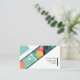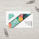 A modern and minimalist business card design featuring a bold, diagonal stripe that divides the card into two sections. The top section is filled with abstract geometric shapes in vibrant colors, creating a visually interesting and eye-catching background. The bottom section contains the contact information in a clean and professional font.