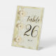 Elegant modern custom narcissus flower with gold frame table number Pedestal Sign design. Background in beige color and black text and number with beige shadow and initials. The flowers and gold frame emphasize the sophistication, elegance, and gala of the ceremony, the couple and their families. The text can be modified according to your needs.