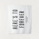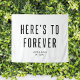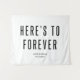 Custom modern wedding backdrop with the quote "here's to forever". Trendy reception or ceremony decorations in white with black text.