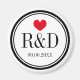 Custom monogram heart wedding party favor magnet. Round shape with red heart and personalized monogram name initial letters. Cute personalized thank you token giveaway for guests. Includes date of marriage. Also great as save the date reminder.