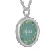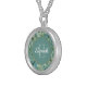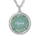 Chic monogrammed, gold frame and eucalyptus greenery necklace with a green background. An elegant personalized name necklace with your name in white cursive calligraphy script and monogram in pale green. A stylish, thoughtful gift for mom, daughter, girlfriend, etc.