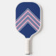 Stand out on court with a custom pickleball paddle! Personalize the template with your monogrammed initials and text — ideal for a player's name, team name, location, or a fun saying. This sports jersey style design features a retro block-style font, trendy script, and matching chevron colors on the reverse side. Perfect for all ages, including kids, teenagers, and adults. Custom paddles make a lovely unique gift for friends, family, and Pickleball enthusiasts! Colors: pink, navy dark blue and white.