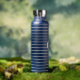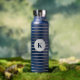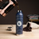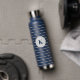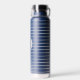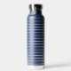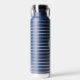 This insulated water bottle is shown in navy blue with gray stripes also with a custom monogram letter sample.