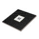 A white polka dot pattern is on a black ceramic tile. A black monogram is on a white square in the center. The square has a faux (not foil) gold trim.