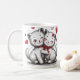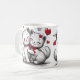 Imagine a white, delicate mug with a smooth and glossy surface. Around it, there's a charming design of cute kittens, all with adorable expressions, big, bright eyes. Some kittens are playfully chasing colorful yarn balls, while others are lying down, striking a "cute" pose with their little paws. The cats are drawn in soft shades of gray, white, and beige, with small pink details on their ears and noses, creating a subtle and endearing contrast. The background of the mug features tiny cat paw prints and hearts scattered around. This mug evokes a cozy, affectionate feeling, perfect for anyone who loves cats and wants a cute, warm touch for their coffee or tea moments.