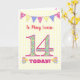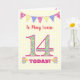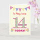 A pretty 14th Birthday card for you to personalize on the front cover, with polka dot bunting, primrose flowers and numbers filled with a primrose pattern, all on a pale yellow check gingham background. The front cover message is, 'To (space for you to add the name) 14 TODAY!' The inside message is just a suggestion and you can easily personalize it or delete it if you prefer.