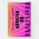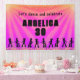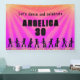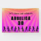 A vibrant wall banner or backdrop to the photo wall. The text and name are customizable for your guest of honor. Disco dancers in silhouette on the dancing floor with glitter and spotlights on a vibrant purple, pink and orange background.