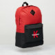 Sturdy back pack, with graphics of a custom red large one letter monogram and smaller white name. Personalize the text fields for a great back to school, sports, or work bag.