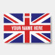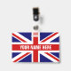 Custom name badge with British Union Jack flag. Plastic name tags available with clip on and lanyard option. Customizable text. Add a photo on the back optionally. Useful ID for office, volunteer work, events, meeting, gathering, delegation, sports team, group, music festival, party and more. English pride. UK flag of United Kingdom, Great Britain.