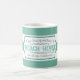 This mug features a nautical theme with teal horizontal stripes in the background. A vintage style frame is in the center with a sample family name and the Beach House title printed in a whimsical teal or aquamarine font. The location of the beach house is printed at the bottom. You can personalize the mug to include your own custom name or text.