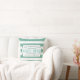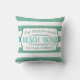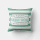 This pillow features a nautical theme with teal horizontal stripes in the background. A vintage style frame is in the center with a sample family name and the Beach House title printed in a whimsical teal or aquamarine font. The location of the beach house is printed at the bottom. You can personalize the pillow to include your own custom name or text.