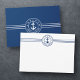 Nautical themed, personalized correspondence office note cards featuring your family name, company, event or other desired text in regal typography. This 2 sided unique design features a custom boat anchor with rope and seven stars for the seas in navy blue and white.