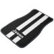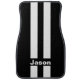 Custom name car mat set of two front shown in a solid color of black with white racing stripes.