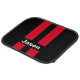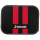 Custom name car mat set of four shown in a solid color of black with red racing stripes.