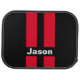 Custom name car mat set of two rear shown in a solid color of black with red racing stripes.