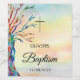 This colorful Baptism Wine Label features a family tree in the colors of the rainbow and a cross on a watercolor background.