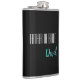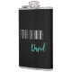 Flask for the father of bride is shown in black with teal and white text and has a sample name.