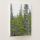 This pocket folder design features a photo of a forest scene with coniferous trees, along with a mountain in the background. It also features a customized name in white colored text within an angled, dark colored area at the top left of the front.