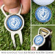A stylish all-in-one personalized divot tool, bottle opener and ball marker! A classic design featuring a victory laurel wreath, framing a ball and tee. This editable template can be customized for a golf club, country club, company name, team player, golf club member or individual golfer. Perfect for commemorating special days, corporate events, competitions, tournaments and more. Printing colors: blue and white. Explore the online collection for matching printed designs!