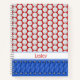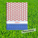Golf balls create a bright polka dot pattern on a red background on both the front and the back of this notebook. On the front, golf clubs are also used in a complementary pattern on a blue background, and there is a white stripe for you to personalize with a name or other text.