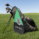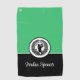 This golf towel is shown as is in a two-tone color of black and green with a white accent stripe and shows an art print of a golfer.