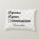 This throw pillow features the text "Grades, gown, Graduation" with a background of graduation caps. you can customized and put the graduates' name.