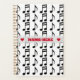 This planner design features a grid of music notes. The front also features a personalized name between two heart shapes in red-colored text, within a hazy light gray colored area. A planner like this might make a great personalized gift for a student or a busy professional. [~Z0000214]
