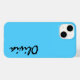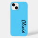 Custom name iphone 14 case is shown in a lovely bright blue color.